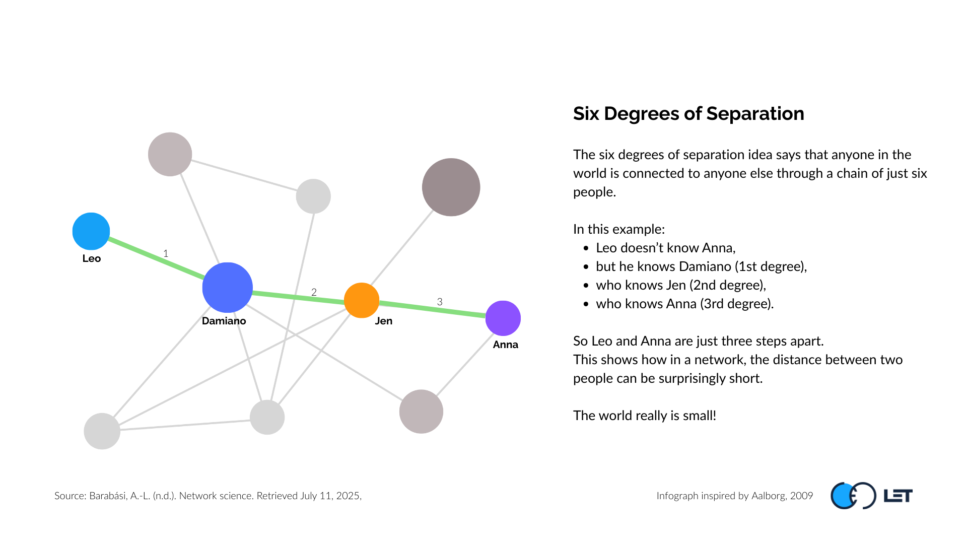 The Small World Phenomenon describes networks where most nodes are not directly connected but can reach each other through a small number of intermediaries. In an ONA context, this structure highlights efficient communication and collaboration across an organization.